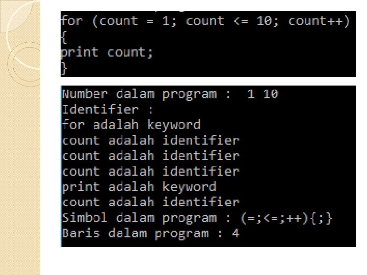 Penganalisa Leksikal Token Deskripsi Informal Contoh Lexeme if Karakter i, f if else Karakter e, l, s, e else compariso n < atau > atau <= atau >= atau == atau != <=, != id Huruf, dapat diikuti oleh huruf dan/atau angka Pi, score, D 2 number Konstanta angka 3. 14159, 0, 6. 02 e 23 literal Apapun yang diapit “ “kata”, “apapun”