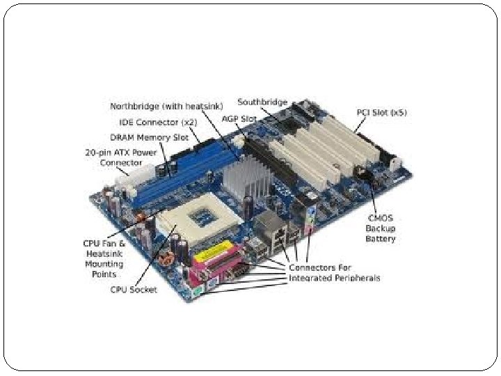 BAGIAN-BAGIAN KOMPUTER Motherboard �Merupakan bagian utama komputer yang berada dalam CPU. Di bagian inilah seluruh komponen lainnya terpasang dan saling berkomunikasi antar bagian, disinilah tempat letak sebagian komponen PC, seperti tempat letak processor, bank memori, dan terdapatnya BIOS. Disini juga pengaturan seluruh kinerja komputer diatur