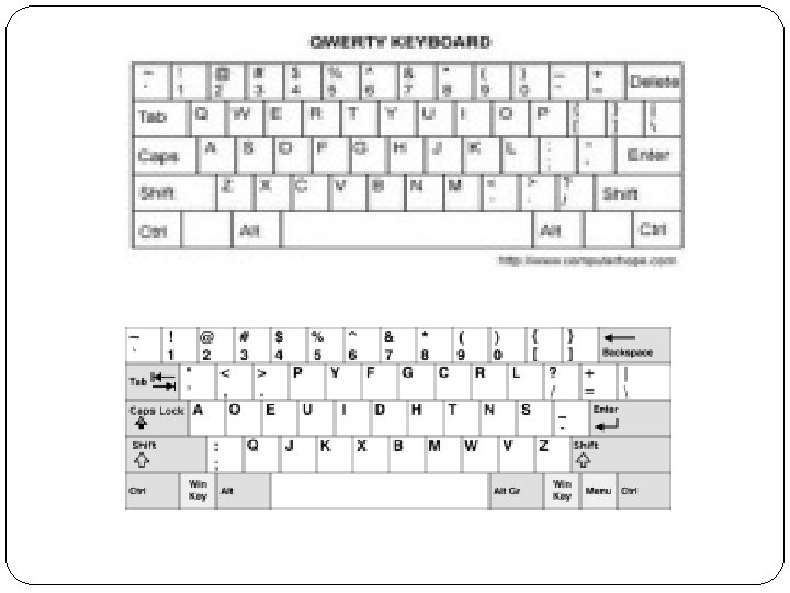 �Jenis-jenis Keyboard : �Keyboard QWERTY �Tata letak keyboard QWERTY ini ditemukan oleh Scholes, Glidden dan Soule pada tahun 1878, dan kemudian menjadi standar mesin tik komersial pada tahun 1905. �Keyboard DVORAK (1932), dimana susunan hurufnya disusun sedemikian rupa sehingga tangan kanan dibebani lebih banyak pekerjaan dibanding dengan tangan kiri.