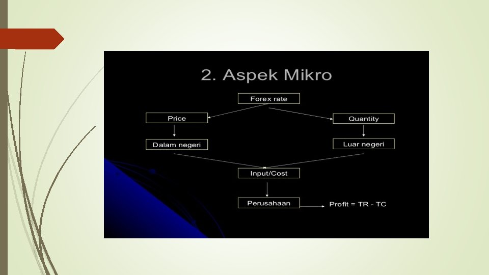 Ditinjau dari Aspek Mikro, Pengaruh Ekonomi Internasional Perusahaan memerlukan input dari dalam maupun luar negeri, variable biaya input adalah (p) dan Kuantitas (Q). Input yang digerakkan secara langsung maupun tidak langsung akan dipengaruhi fluktuasi kurs valas (forex rate).