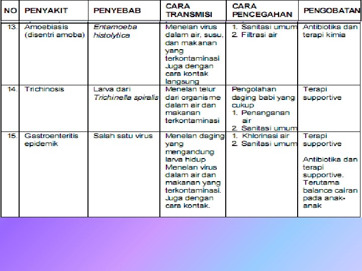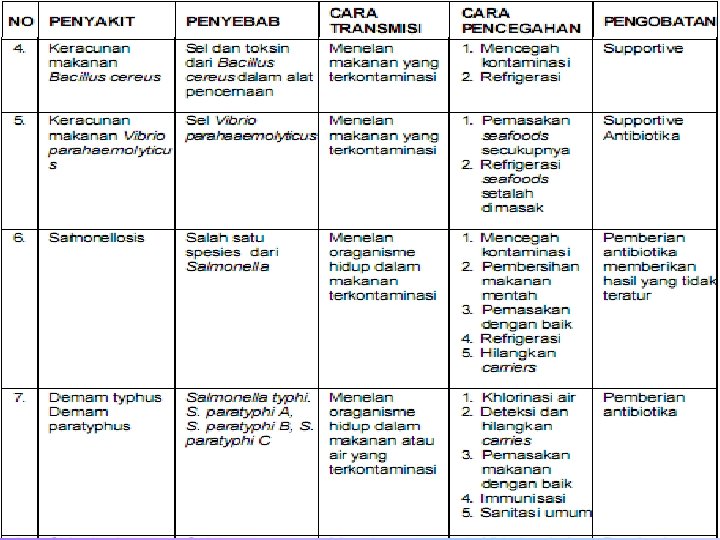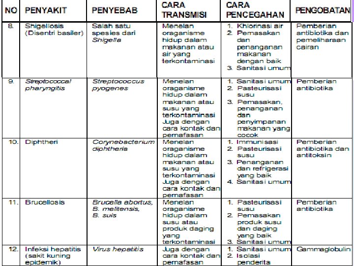 Corynebacterium diphteriae adalah patogen yang menyebabkan difteri dan dpt ditularkan melalui makanan. Penyakitpenyakit spesifik pada paru-paru terutama TBC, pneumonia (Diplococcus pneumoniae). Organisme lain yg terlibat dalam pneumonia adl Staphylococcus aureus, Klebsiella pneumoniae, Streptococcus pyogenes, dan virus. 3. Alat Pencernaan Komposisi flora pencernaan dari tubuh manusia sehat dapat bervariasi dengan faktor eksternal tertentu. Bagian pertama usus kecil, seperti perut, tidak mempunyai flora mikroba alamiah. Dalam jejunum dan ileum, mikroba baru terdapat. Pada bagian ujung bawah dr usus kecil ditemukan bermacam bakteri dalam jumlah banyak. Mikroba utama yang terdapat adalah koliform, Eschericia coli dan Aerobacter aerogenes.