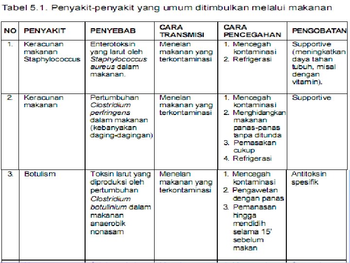 Sumber-sumber kontaminan Pekerja/manusia Pekerja yg menangani pangan dlm suatu industri pangan adalah sumber kontaminasi yg penting, krn kandungan mikroba patogen pd manusia dpt menimbulkan penyakit yg ditularkan melalui makanan. Manusia yg sehat merupakan sumber potensial mikroba-mikroba seperti Staphylococcus aureus, baik koagulase positif maupun koagulase negatif; Salmonella, Clostridium perfringens dan streptokoki (enterokoki) dari kotoran (tinja). Stafilokoki umum terdapat dalam kulit, hidung, mulut dan tenggorokan, serta dapat dengan mudah dipindahkan ke dalam makanan. Selain bahaya biologis, manusia juga membawa bahaya fisik. Misal rambut dan perhiasan (cincin) yang tidak disadari jatuh ke dalam makanan.