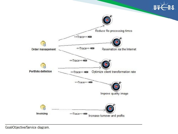 Goal/objective/service diagram Nama Diagram goal/objective/service Ahli pakar Pakar/ahli bisnis Desainer/perancang Analis Bisnis (business analyst) Penerima Analis Bisnis, arsiek aplikasi Tujuan Menyajikan layanan yang berkontribusi terhadap realisasi sasaran Informasi awal bermanfaat Functional decomposition perusahaan, layanan teridentifikasi, sasaran
