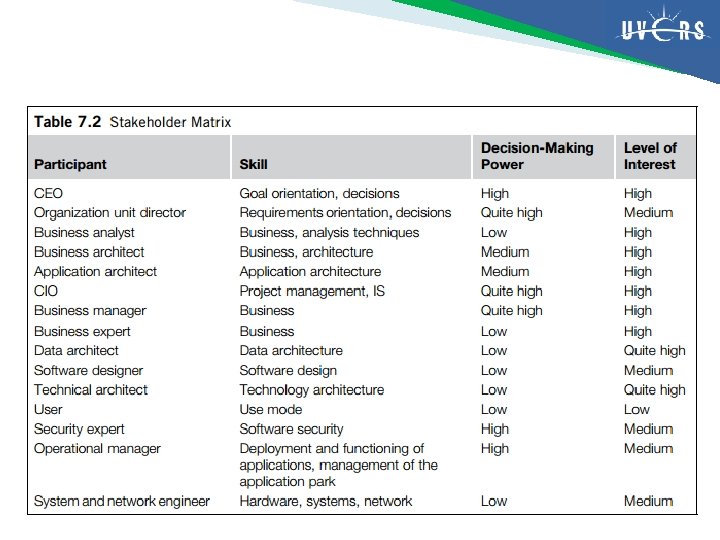 Stakeholder matrix Nama Matriks stakeholder Ahli pakar Pimpinan, Direktur, Manajer Desainer/perancang Analis Bisnis (business analyst) Penerima Semua partisipan dalam arsitektur enterprise Tujuan Menentukan aktor yang berpartisipasi dalam pembangunan arsitektur enterprise untuk memfasilitasi organisasi dan siklus ADM serta menentukan artefak apa yang dibuat oleh siapa Informasi awal bermanfaat Aktor dan sumberdaya manusia dalam perusahaan