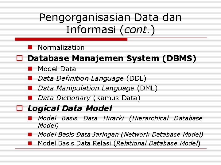 Pengorganisasian Data dan Informasi (cont. ) n Normalization o Database Manajemen System (DBMS) n n Model Data Definition Language (DDL) Data Manipulation Language (DML) Data Dictionary (Kamus Data) o Logical Data Model n Model Basis Data Hirarki (Hierarchical Database Model) n Model Basis Data Jaringan (Network Database Model) n Model Basis Data Relasi (Relational Database Model)
