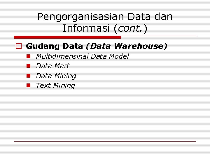 Pengorganisasian Data dan Informasi (cont. ) o Gudang Data (Data Warehouse) n n Multidimensinal Data Model Data Mart Data Mining Text Mining