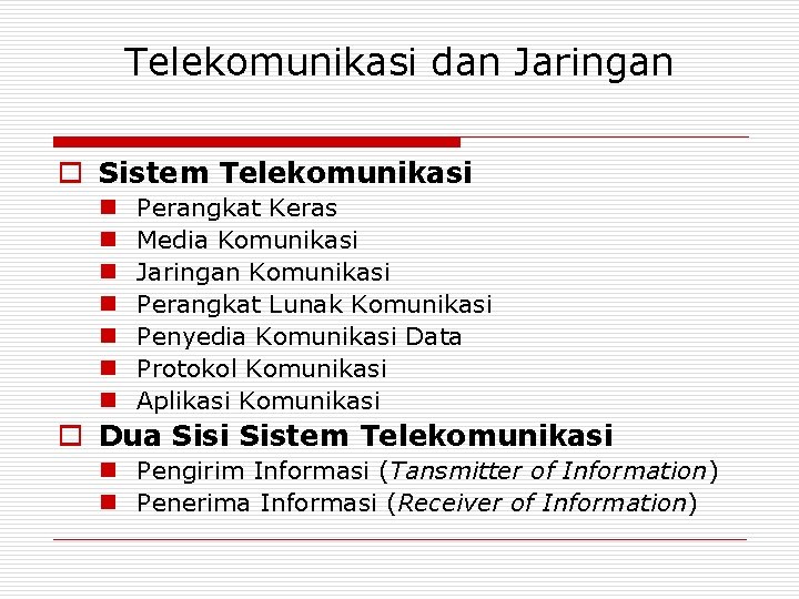 Telekomunikasi dan Jaringan o Sistem Telekomunikasi n n n n Perangkat Keras Media Komunikasi Jaringan Komunikasi Perangkat Lunak Komunikasi Penyedia Komunikasi Data Protokol Komunikasi Aplikasi Komunikasi o Dua Sisi Sistem Telekomunikasi n Pengirim Informasi (Tansmitter of Information) n Penerima Informasi (Receiver of Information)