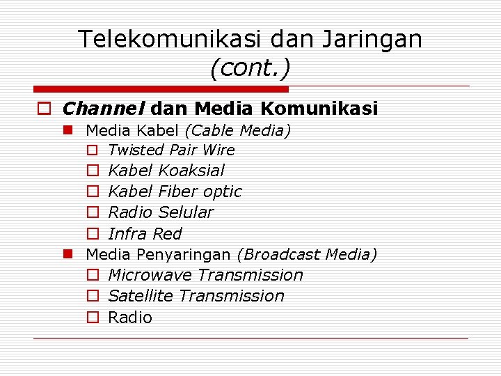 Telekomunikasi dan Jaringan (cont. ) o Channel dan Media Komunikasi n Media Kabel (Cable Media) o Twisted Pair Wire o Kabel Koaksial o Kabel Fiber optic o Radio Selular o Infra Red n Media Penyaringan (Broadcast Media) o Microwave Transmission o Satellite Transmission o Radio