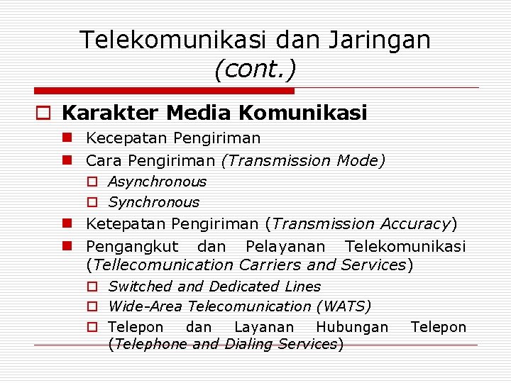 Telekomunikasi dan Jaringan (cont. ) o Karakter Media Komunikasi n Kecepatan Pengiriman n Cara Pengiriman (Transmission Mode) o Asynchronous o Synchronous n Ketepatan Pengiriman (Transmission Accuracy) n Pengangkut dan Pelayanan Telekomunikasi (Tellecomunication Carriers and Services) o Switched and Dedicated Lines o Wide-Area Telecomunication (WATS) o Telepon dan Layanan Hubungan (Telephone and Dialing Services) Telepon