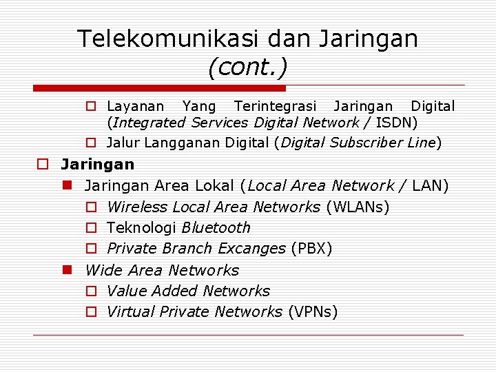 Telekomunikasi dan Jaringan (cont. ) o Layanan Yang Terintegrasi Jaringan Digital (Integrated Services Digital Network / ISDN) o Jalur Langganan Digital (Digital Subscriber Line) o Jaringan n Jaringan Area Lokal (Local Area Network / LAN) o Wireless Local Area Networks (WLANs) o Teknologi Bluetooth o Private Branch Excanges (PBX) n Wide Area Networks o Value Added Networks o Virtual Private Networks (VPNs)