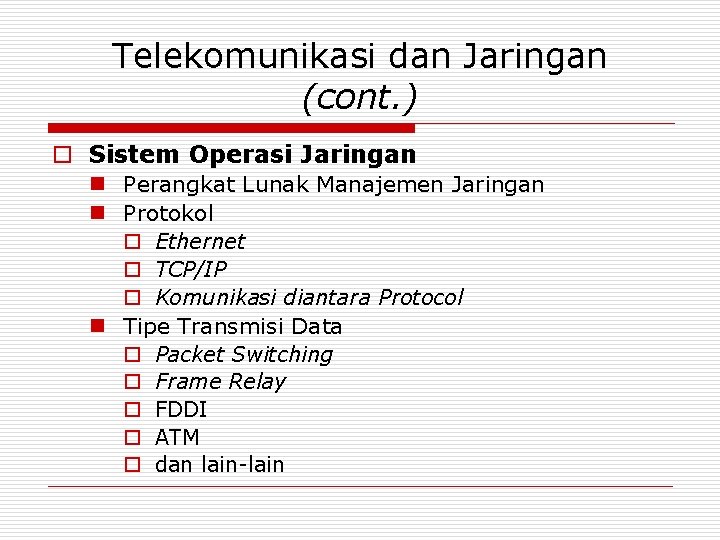Telekomunikasi dan Jaringan (cont. ) o Sistem Operasi Jaringan n Perangkat Lunak Manajemen Jaringan n Protokol o Ethernet o TCP/IP o Komunikasi diantara Protocol n Tipe Transmisi Data o Packet Switching o Frame Relay o FDDI o ATM o dan lain-lain