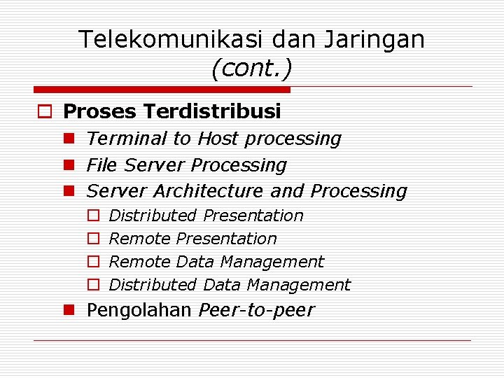 Telekomunikasi dan Jaringan (cont. ) o Proses Terdistribusi n Terminal to Host processing n File Server Processing n Server Architecture and Processing o o Distributed Presentation Remote Data Management Distributed Data Management n Pengolahan Peer-to-peer
