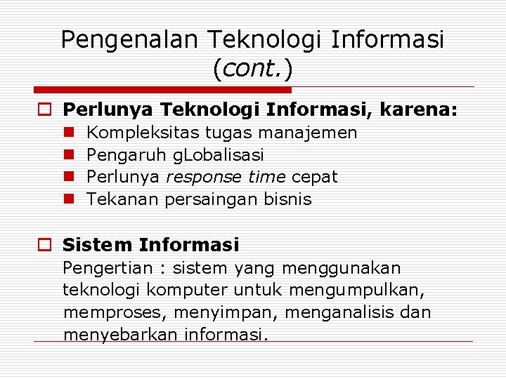 Pengenalan Teknologi Informasi (cont. ) o Perlunya Teknologi Informasi, karena: n n Kompleksitas tugas manajemen Pengaruh g. Lobalisasi Perlunya response time cepat Tekanan persaingan bisnis o Sistem Informasi Pengertian : sistem yang menggunakan teknologi komputer untuk mengumpulkan, memproses, menyimpan, menganalisis dan menyebarkan informasi.