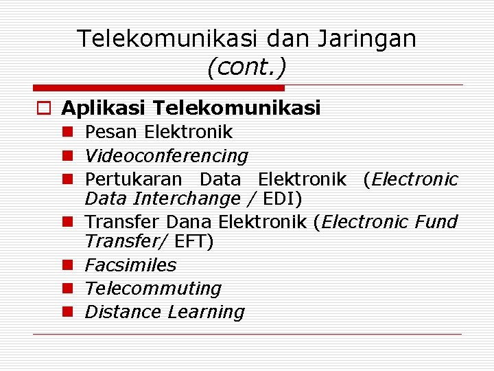 Telekomunikasi dan Jaringan (cont. ) o Aplikasi Telekomunikasi n Pesan Elektronik n Videoconferencing n Pertukaran Data Elektronik (Electronic Data Interchange / EDI) n Transfer Dana Elektronik (Electronic Fund Transfer/ EFT) n Facsimiles n Telecommuting n Distance Learning
