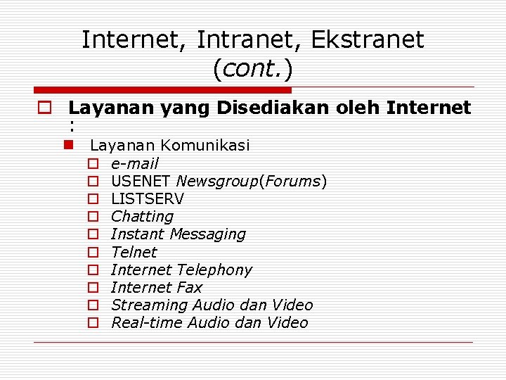 Internet, Intranet, Ekstranet (cont. ) o Layanan yang Disediakan oleh Internet : n Layanan Komunikasi o e-mail o USENET Newsgroup(Forums) o LISTSERV o Chatting o Instant Messaging o Telnet o Internet Telephony o Internet Fax o Streaming Audio dan Video o Real-time Audio dan Video