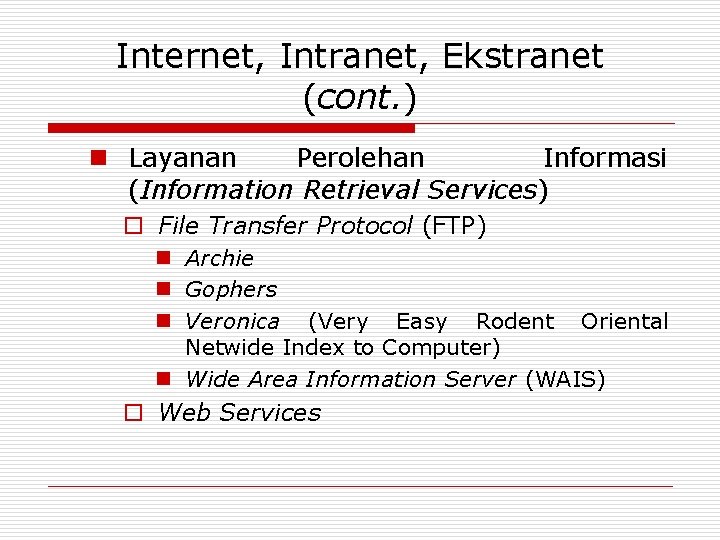 Internet, Intranet, Ekstranet (cont. ) n Layanan Perolehan Informasi (Information Retrieval Services) o File Transfer Protocol (FTP) n Archie n Gophers n Veronica (Very Easy Rodent Oriental Netwide Index to Computer) n Wide Area Information Server (WAIS) o Web Services