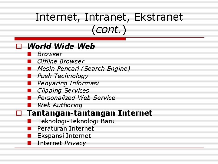 Internet, Intranet, Ekstranet (cont. ) o World Wide Web n n n n Browser Offline Browser Mesin Pencari (Search Engine) Push Technology Penyaring Informasi Clipping Services Personalized Web Service Web Authoring n n Teknologi-Teknologi Baru Peraturan Internet Ekspansi Internet Privacy o Tantangan-tantangan Internet