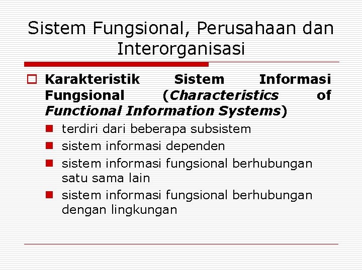 Sistem Fungsional, Perusahaan dan Interorganisasi o Karakteristik Sistem Informasi Fungsional (Characteristics of Functional Information Systems) n terdiri dari beberapa subsistem n sistem informasi dependen n sistem informasi fungsional berhubungan satu sama lain n sistem informasi fungsional berhubungan dengan lingkungan