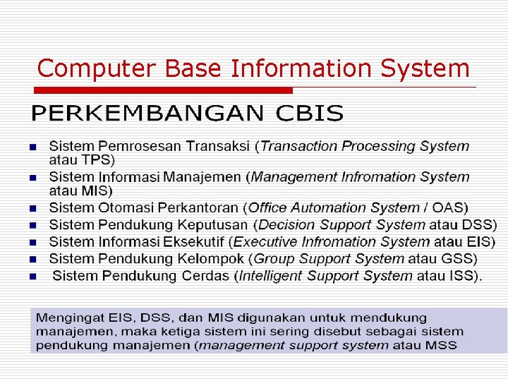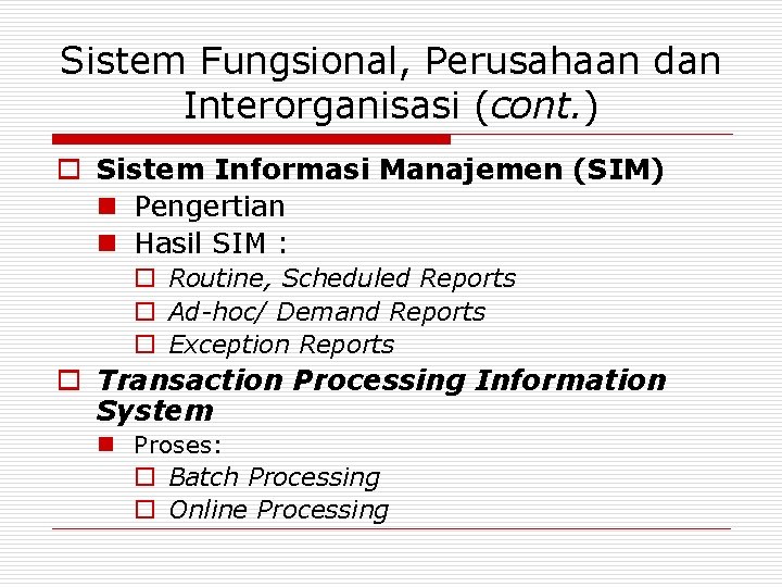 Sistem Fungsional, Perusahaan dan Interorganisasi (cont. ) o Sistem Informasi Manajemen (SIM) n Pengertian n Hasil SIM : o Routine, Scheduled Reports o Ad-hoc/ Demand Reports o Exception Reports o Transaction Processing Information System n Proses: o Batch Processing o Online Processing