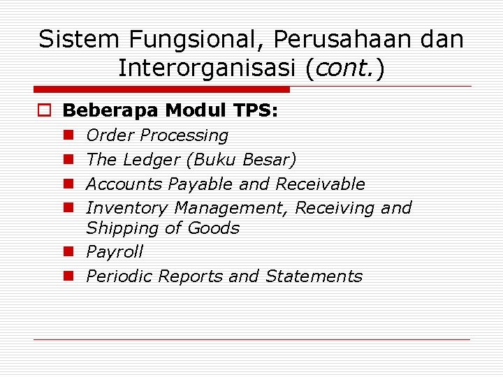 Sistem Fungsional, Perusahaan dan Interorganisasi (cont. ) o Beberapa Modul TPS: Order Processing The Ledger (Buku Besar) Accounts Payable and Receivable Inventory Management, Receiving and Shipping of Goods n Payroll n Periodic Reports and Statements n n