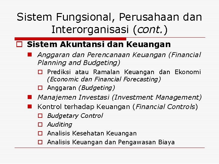 Sistem Fungsional, Perusahaan dan Interorganisasi (cont. ) o Sistem Akuntansi dan Keuangan n Anggaran dan Perencanaan Keuangan (Financial Planning and Budgeting) o Prediksi atau Ramalan Keuangan dan Ekonomi (Economic dan Financial Forecasting) o Anggaran (Budgeting) n Manajemen Investasi (Investment Management) n Kontrol terhadap Keuangan (Financial Controls) o o Budgetary Control Auditing Analisis Kesehatan Keuangan Analisis Keuangan dan Pengawasan Biaya