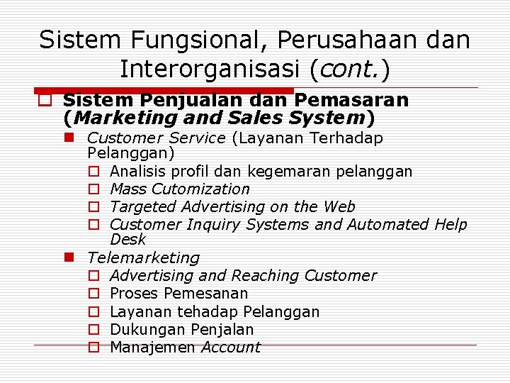 Sistem Fungsional, Perusahaan dan Interorganisasi (cont. ) o Sistem Penjualan dan Pemasaran (Marketing and Sales System) n Customer Service (Layanan Terhadap Pelanggan) o Analisis profil dan kegemaran pelanggan o Mass Cutomization o Targeted Advertising on the Web o Customer Inquiry Systems and Automated Help Desk n Telemarketing o Advertising and Reaching Customer o Proses Pemesanan o Layanan tehadap Pelanggan o Dukungan Penjalan o Manajemen Account