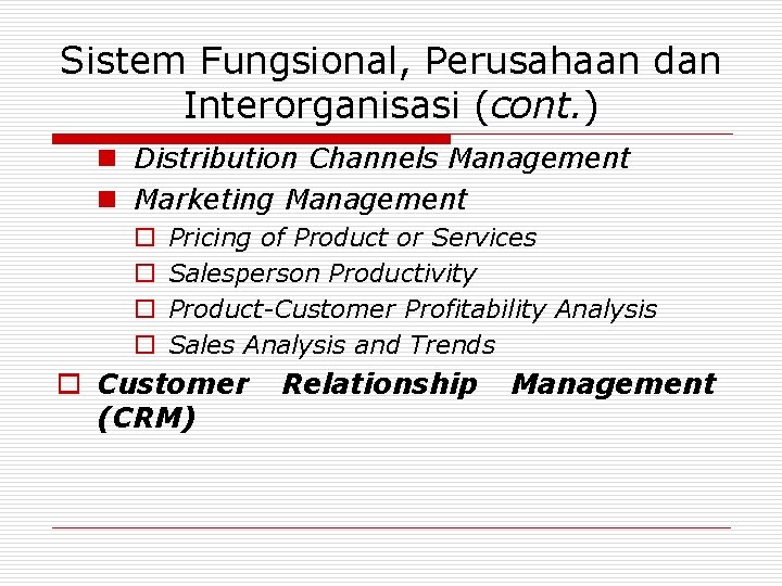 Sistem Fungsional, Perusahaan dan Interorganisasi (cont. ) n Distribution Channels Management n Marketing Management o o Pricing of Product or Services Salesperson Productivity Product-Customer Profitability Analysis Sales Analysis and Trends o Customer (CRM) Relationship Management