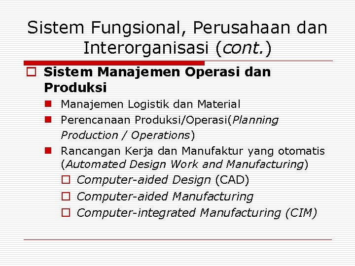 Sistem Fungsional, Perusahaan dan Interorganisasi (cont. ) o Sistem Manajemen Operasi dan Produksi n Manajemen Logistik dan Material n Perencanaan Produksi/Operasi(Planning Production / Operations) n Rancangan Kerja dan Manufaktur yang otomatis (Automated Design Work and Manufacturing) o Computer-aided Design (CAD) o Computer-aided Manufacturing o Computer-integrated Manufacturing (CIM)