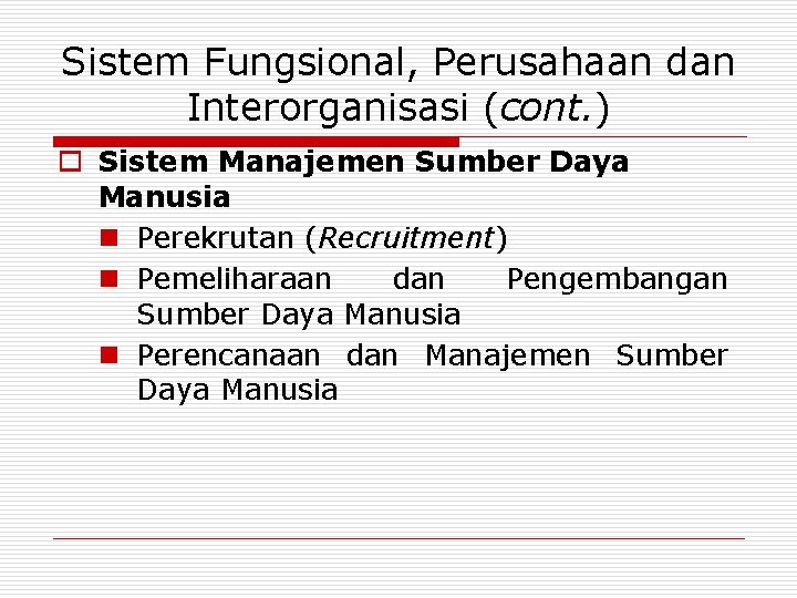 Sistem Fungsional, Perusahaan dan Interorganisasi (cont. ) o Sistem Manajemen Sumber Daya Manusia n Perekrutan (Recruitment) n Pemeliharaan dan Pengembangan Sumber Daya Manusia n Perencanaan dan Manajemen Sumber Daya Manusia