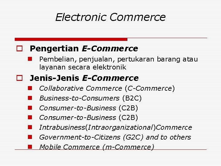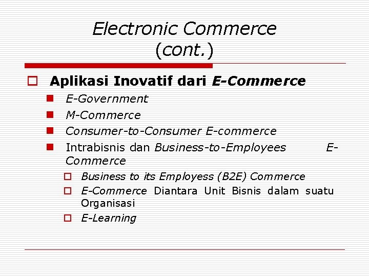 Electronic Commerce (cont. ) o Aplikasi Inovatif dari E-Commerce n n E-Government M-Commerce Consumer-to-Consumer E-commerce Intrabisnis dan Business-to-Employees Commerce E- o Business to its Employess (B 2 E) Commerce o E-Commerce Diantara Unit Bisnis dalam suatu Organisasi o E-Learning