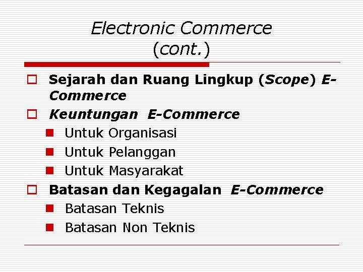 Electronic Commerce (cont. ) o Sejarah dan Ruang Lingkup (Scope) ECommerce o Keuntungan E-Commerce n Untuk Organisasi n Untuk Pelanggan n Untuk Masyarakat o Batasan dan Kegagalan E-Commerce n Batasan Teknis n Batasan Non Teknis