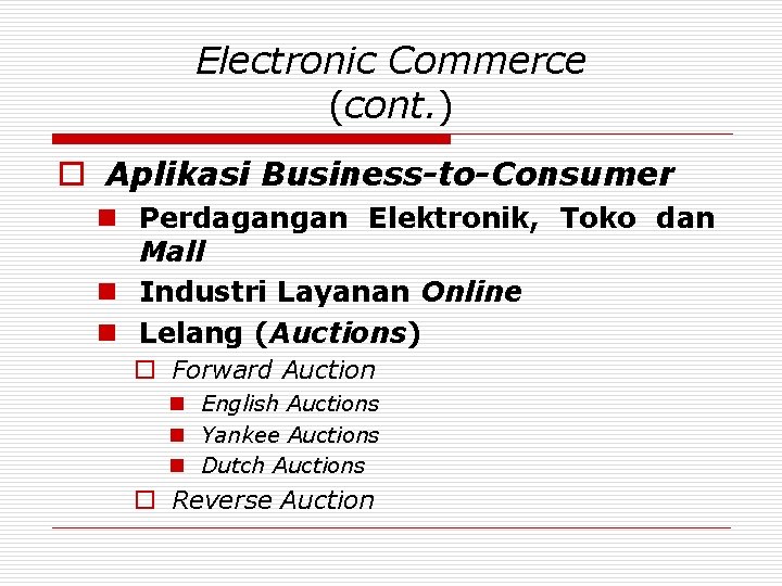 Electronic Commerce (cont. ) o Aplikasi Business-to-Consumer n Perdagangan Elektronik, Toko dan Mall n Industri Layanan Online n Lelang (Auctions) o Forward Auction n English Auctions n Yankee Auctions n Dutch Auctions o Reverse Auction