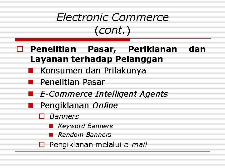 Electronic Commerce (cont. ) o Penelitian Pasar, Periklanan Layanan terhadap Pelanggan n Konsumen dan Prilakunya n Penelitian Pasar n E-Commerce Intelligent Agents n Pengiklanan Online o Banners n Keyword Banners n Random Banners o Pengiklanan melalui e-mail dan