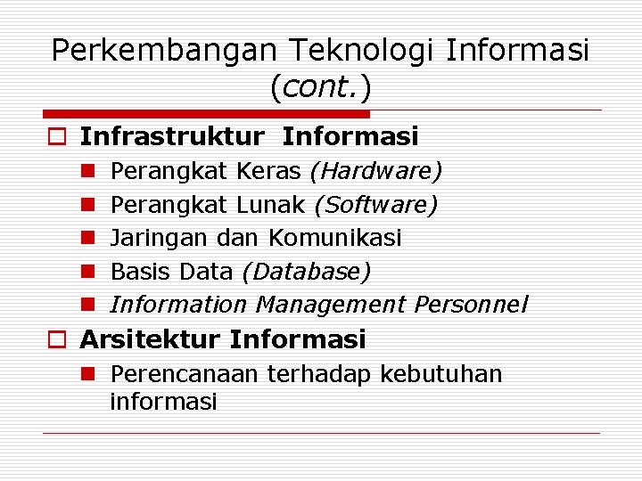 Perkembangan Teknologi Informasi (cont. ) o Infrastruktur Informasi n n n Perangkat Keras (Hardware) Perangkat Lunak (Software) Jaringan dan Komunikasi Basis Data (Database) Information Management Personnel o Arsitektur Informasi n Perencanaan terhadap kebutuhan informasi