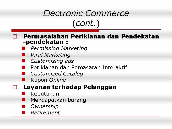 Electronic Commerce (cont. ) o Permasalahan Periklanan dan Pendekatan -pendekatan : n n n Permission Marketing Viral Marketing Customizing ads Periklanan dan Pemasaran Interaktif Customized Catalog Kupon Online o Layanan terhadap Pelanggan n n Kebutuhan Mendapatkan barang Ownership Retirement