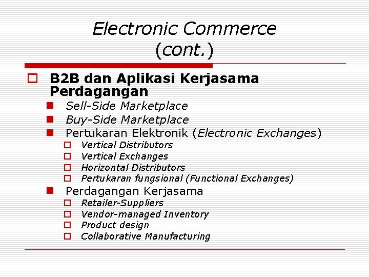 Electronic Commerce (cont. ) o B 2 B dan Aplikasi Kerjasama Perdagangan n Sell-Side Marketplace n Buy-Side Marketplace n Pertukaran Elektronik (Electronic Exchanges) o o Vertical Distributors Vertical Exchanges Horizontal Distributors Pertukaran fungsional (Functional Exchanges) o o Retailer-Suppliers Vendor-managed Inventory Product design Collaborative Manufacturing n Perdagangan Kerjasama