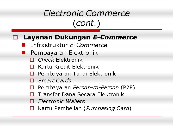 Electronic Commerce (cont. ) o Layanan Dukungan E-Commerce n Infrastruktur E-Commerce n Pembayaran Elektronik o o o o Check Elektronik Kartu Kredit Elektronik Pembayaran Tunai Elektronik Smart Cards Pembayaran Person-to-Person (P 2 P) Transfer Dana Secara Elektronik Electronic Wallets Kartu Pembelian (Purchasing Card)