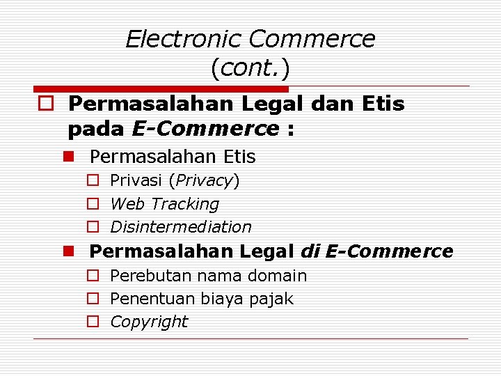 Electronic Commerce (cont. ) o Permasalahan Legal dan Etis pada E-Commerce : n Permasalahan Etis o Privasi (Privacy) o Web Tracking o Disintermediation n Permasalahan Legal di E-Commerce o Perebutan nama domain o Penentuan biaya pajak o Copyright