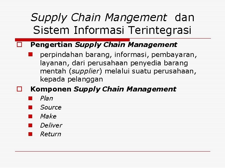 Supply Chain Mangement dan Sistem Informasi Terintegrasi Pengertian Supply Chain Management n perpindahan barang, informasi, pembayaran, layanan, dari perusahaan penyedia barang mentah (supplier) melalui suatu perusahaan, kepada pelanggan o Komponen Supply Chain Management o n n n Plan Source Make Deliver Return