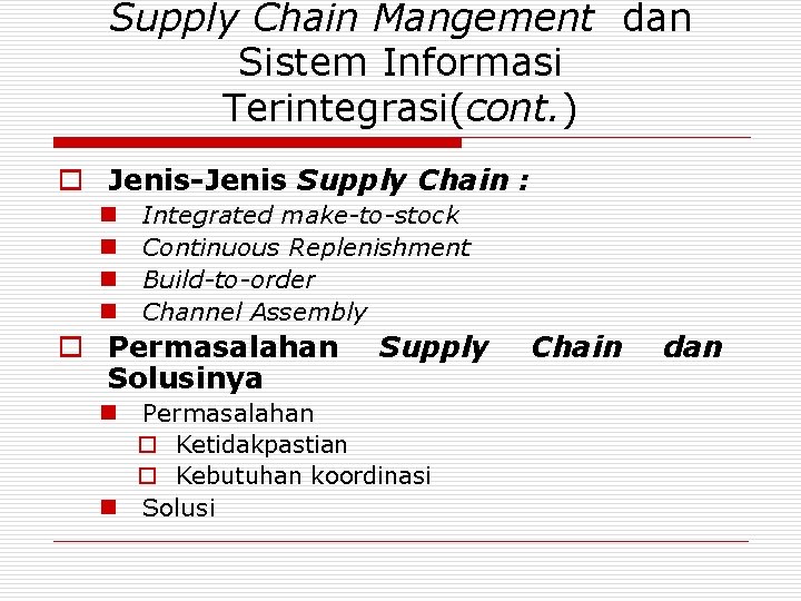 Supply Chain Mangement dan Sistem Informasi Terintegrasi(cont. ) o Jenis-Jenis Supply Chain : n n Integrated make-to-stock Continuous Replenishment Build-to-order Channel Assembly o Permasalahan Solusinya Supply n Permasalahan o Ketidakpastian o Kebutuhan koordinasi n Solusi Chain dan