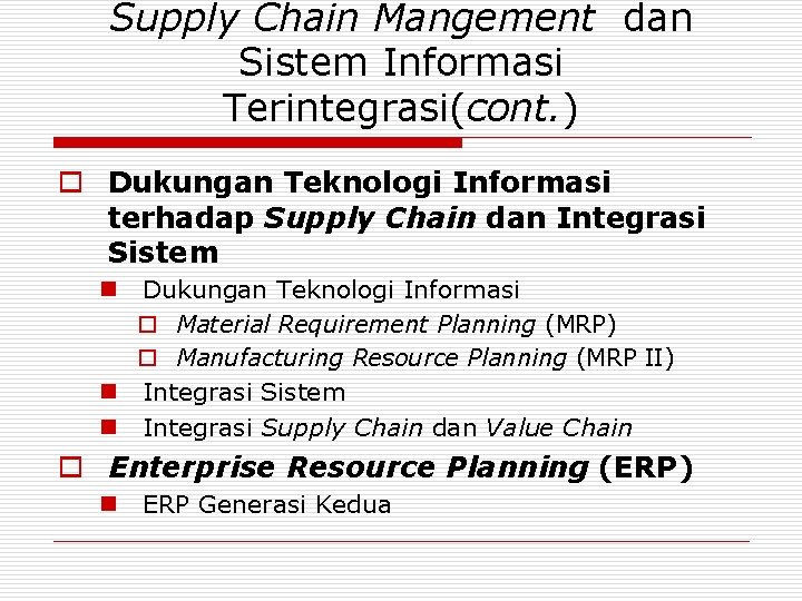 Supply Chain Mangement dan Sistem Informasi Terintegrasi(cont. ) o Dukungan Teknologi Informasi terhadap Supply Chain dan Integrasi Sistem n Dukungan Teknologi Informasi o Material Requirement Planning (MRP) o Manufacturing Resource Planning (MRP II) n Integrasi Sistem n Integrasi Supply Chain dan Value Chain o Enterprise Resource Planning (ERP) n ERP Generasi Kedua