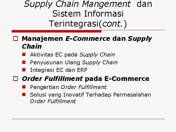 Supply Chain Mangement dan Sistem Informasi Terintegrasi(cont. ) o Manajemen E-Commerce dan Supply Chain n Aktivitas EC pada Supply Chain n Penyusunan Ulang Supply Chain n Integrasi EC dan ERP o Order Fulfillment pada E-Commerce n Pengertian Order Fulfillment n Solusi yang Inovatif Terhadap Permasalahan Order Fulfillment