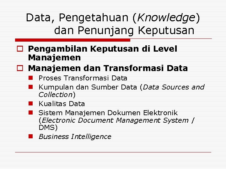 Data, Pengetahuan (Knowledge) dan Penunjang Keputusan o Pengambilan Keputusan di Level Manajemen o Manajemen dan Transformasi Data n Proses Transformasi Data n Kumpulan dan Sumber Data (Data Sources and Collection) n Kualitas Data n Sistem Manajemen Dokumen Elektronik (Electronic Document Management System / DMS) n Business Intelligence