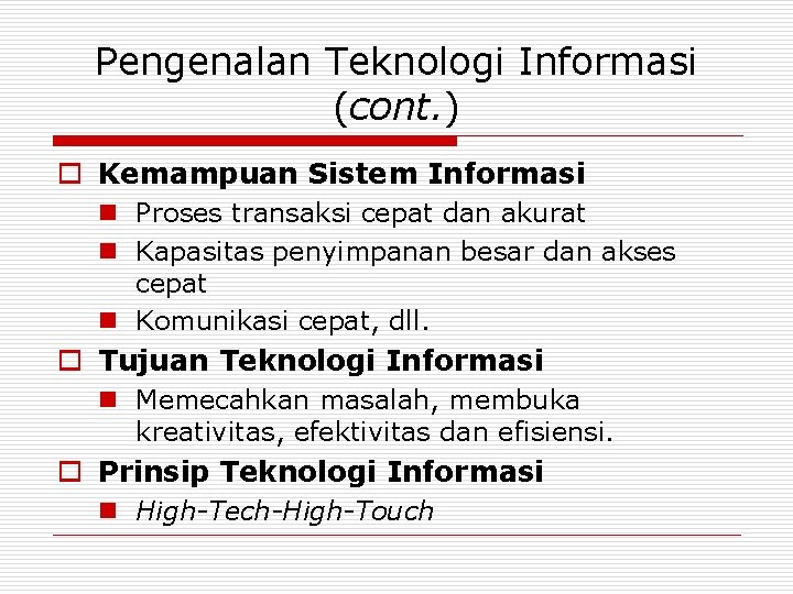Pengenalan Teknologi Informasi (cont. ) o Kemampuan Sistem Informasi n Proses transaksi cepat dan akurat n Kapasitas penyimpanan besar dan akses cepat n Komunikasi cepat, dll. o Tujuan Teknologi Informasi n Memecahkan masalah, membuka kreativitas, efektivitas dan efisiensi. o Prinsip Teknologi Informasi n High-Tech-High-Touch