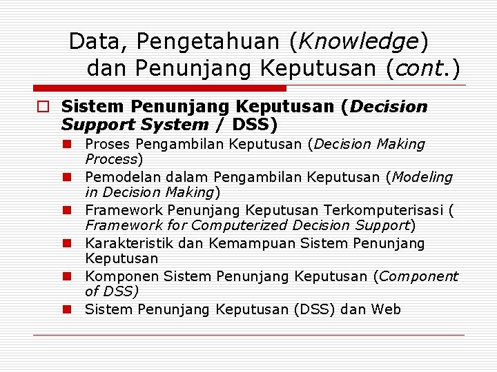Data, Pengetahuan (Knowledge) dan Penunjang Keputusan (cont. ) o Sistem Penunjang Keputusan (Decision Support System / DSS) n Proses Pengambilan Keputusan (Decision Making Process) n Pemodelan dalam Pengambilan Keputusan (Modeling in Decision Making) n Framework Penunjang Keputusan Terkomputerisasi ( Framework for Computerized Decision Support) n Karakteristik dan Kemampuan Sistem Penunjang Keputusan n Komponen Sistem Penunjang Keputusan (Component of DSS) n Sistem Penunjang Keputusan (DSS) dan Web