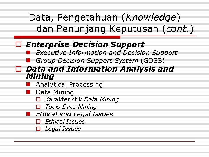 Data, Pengetahuan (Knowledge) dan Penunjang Keputusan (cont. ) o Enterprise Decision Support n Executive Information and Decision Support n Group Decision Support System (GDSS) o Data and Information Analysis and Mining n Analytical Processing n Data Mining o Karakteristik Data Mining o Tools Data Mining n Ethical and Legal Issues o Ethical Issues o Legal Issues