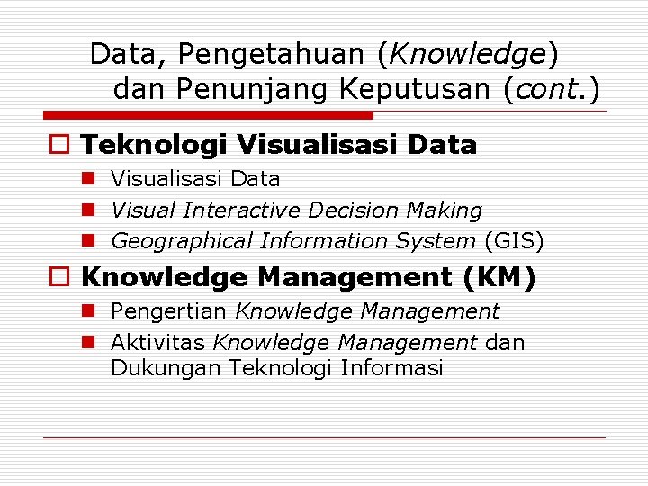 Data, Pengetahuan (Knowledge) dan Penunjang Keputusan (cont. ) o Teknologi Visualisasi Data n Visual Interactive Decision Making n Geographical Information System (GIS) o Knowledge Management (KM) n Pengertian Knowledge Management n Aktivitas Knowledge Management dan Dukungan Teknologi Informasi
