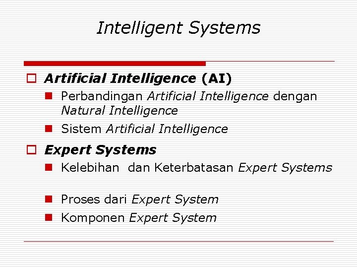 Intelligent Systems o Artificial Intelligence (AI) n Perbandingan Artificial Intelligence dengan Natural Intelligence n Sistem Artificial Intelligence o Expert Systems n Kelebihan dan Keterbatasan Expert Systems n Proses dari Expert System n Komponen Expert System
