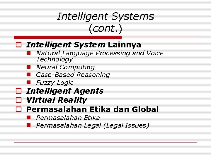 Intelligent Systems (cont. ) o Intelligent System Lainnya n Natural Language Processing and Voice Technology n Neural Computing n Case-Based Reasoning n Fuzzy Logic o Intelligent Agents o Virtual Reality o Permasalahan Etika dan Global n Permasalahan Etika n Permasalahan Legal (Legal Issues)