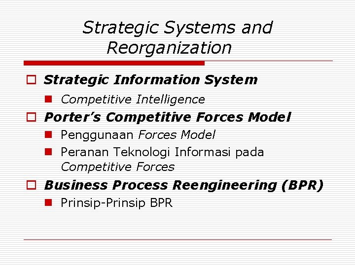 Strategic Systems and Reorganization o Strategic Information System n Competitive Intelligence o Porter’s Competitive Forces Model n Penggunaan Forces Model n Peranan Teknologi Informasi pada Competitive Forces o Business Process Reengineering (BPR) n Prinsip-Prinsip BPR